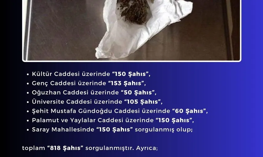 Bingöl'de polis uygulamasında 818 kişi sorgulandı; 1 şahıstan 1,52 gram esrar ele geçirildi
