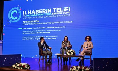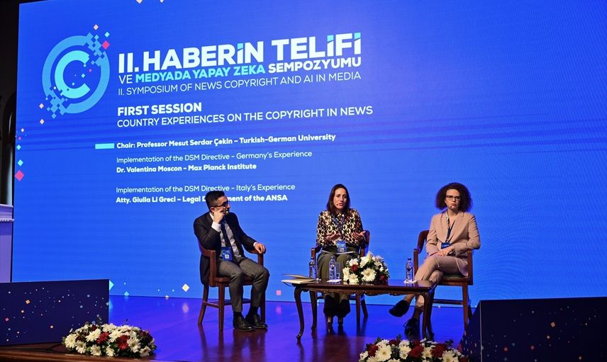 Anadolu Ajansı (AA) ve Boğaziçi Üniversitesi işbirliğinde, Kültür ve Turizm Bakanlığının katkılarıyla üniversitenin güney kampüsündeki Albert Long Hall Binası'nda düzenlenen "2. Haberin Telifi ve Medyada Yapay Zeka" sempozyumunda, haberin telifine ilişkin ülkelerin tecrübeleri ele alındı. Türk-Alman Üniversitesinden Prof. Dr. Mesut Serdar Çekin'in (solda) moderatörlüğünde "Haberin Telifine İlişkin Ülke Tecrübeleri" başlıklı oturumda, Max Planck Enstitüsünden Dr. Valentina Moscon (ortada) ve İtalyan haber ajansı ANSA Hukuk Direktörü Avukat Giulia Li Greci (sağda) konuşma yaptı.