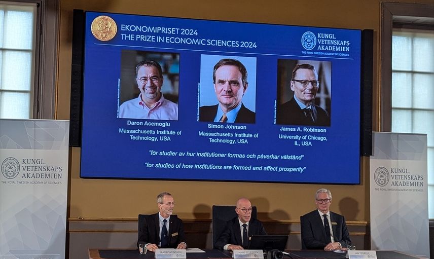 İsveç Kraliyet Bilimler Akademisi'nde düzenlenen basın toplantısında, Nobel Ekonomi Ödülü'nün kazananları açıklandı. 2024 Nobel Ekonomi Ödülü'ne, kurumların oluşumu ve refaha etkilerine ilişkin çalışmalarından dolayı Daron Acemoğlu, Simon Johnson ve James Robinson layık görüldü.