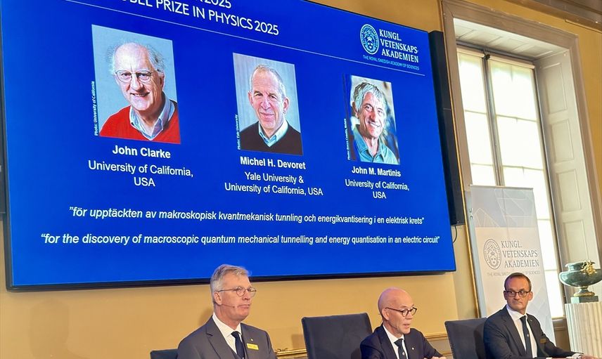 İsveç Kraliyet Bilimler Akademisi'nde düzenlenen basın toplantısında, 2025 Nobel Fizik Ödülü'nün sahipleri açıklandı. 2025 Nobel Fizik Ödülü, "elektrik devresinde makroskopik kuantum mekanik tünelleme ve enerji kuantizasyonunun keşfine" ilişkin çalışmalarından dolayı İngiliz John Clarke, Fransız Michel Devoret ve ABD'li John Martinis'e verildi.