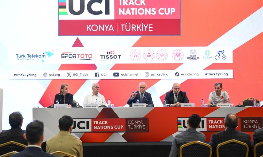 2025 UCI Pist Bisikleti Uluslar Kupası'nın basın ve tanıtım toplantısı, Konya'da bir otelde yapıldı. Türkiye Bisiklet Federasyonu Başkanı Emin Müftüoğlu (ortada), toplantıda konuşma yaptı.