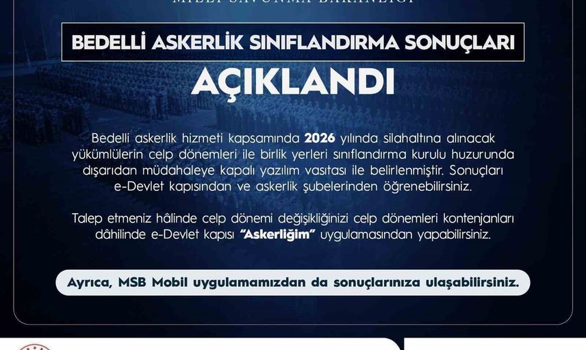 Bedelli askerlik kapsamında 2026 yılı sınıflandırma sonuçları resmî olarak duyuruldu. İlgili duyuru, yükümlüleri ve kamuoyunu bilgilendirmek amacıyla yayımlandı.