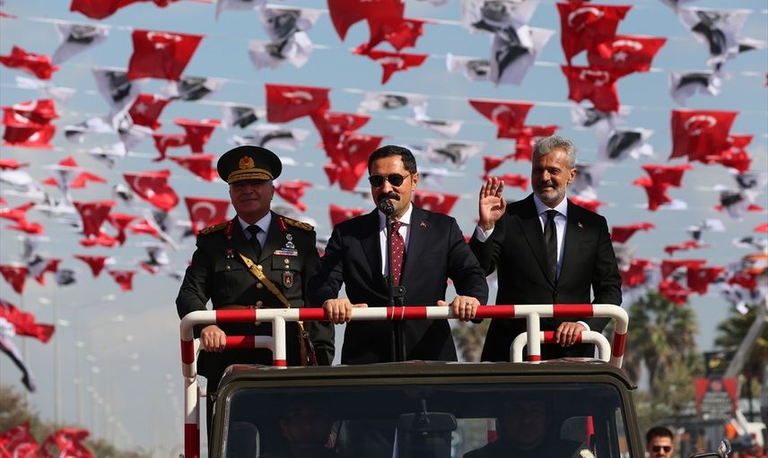 Hatay'ın merkez Antakya ilçesinde, 29 Ekim Cumhuriyet Bayramı törenle kutlandı. Törende Vali Mustafa Masatlı (ortada), Garnizon Komutanı Tuğgeneral Ali Mete (solda) ve Büyükşehir Belediye Başkanı Mehmet Öntürk (sağda), tören aracı üzerinden selamladıkları vatandaşların bayramını kutladı.