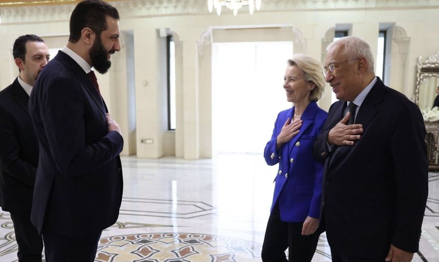 Antonio Costa ve Ursula von der Leyen’in Şam ziyareti, Esad rejiminin devrilmesinden bu yana Suriye’de gerçekleşen ilk AB üst düzey temasını işaret ediyor. AB Konseyi Başkanı Antonio Costa ve AB Komisyonu Başkanı Ursula von der Leyen, başkent Şam’daki Halk Sarayı’nda Suriye Devlet Başkanı Ahmed eş-Şara ile bir araya geldi.