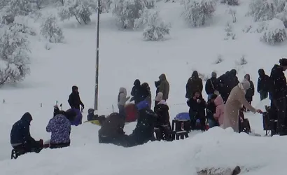Bolu'nun doğa harikası Abant Gölü Milli Parkı, yarıyıl tatilinde artan ziyaretçi yoğunluğuyla hareketlenirken Örencik köyü sakinleri park girişindeki dik yamaçları kendi imkanlarıyla doğal bir kayak alanına dönüştürdü. Bölgedeki kar yağışını değerlendiren köylüler, hazırladıkları rampalar ve ekipmanlarla tatilcilere alternatif bir kar eğlencesi sundu.