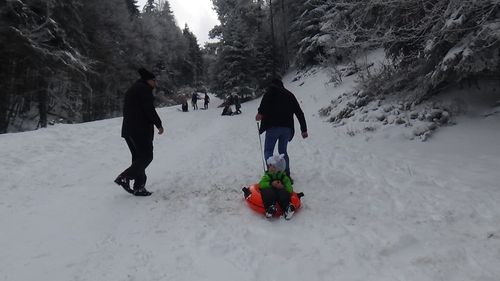 Abant Gölü Milli Parkı karla kaplandı; ziyaretçiler şambrel ve poşetlerle tepelerden kayarak hafta sonu tadını çıkardı.