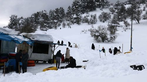 Abant Gölü Milli Parkı’nda Örencik köyü sakinlerinin hazırladığı pistte çocuklar şambrellerle kaydı; ziyaretçiler göl çevresinde yürüyüş ve kar manzarasının tadını çıkardı.