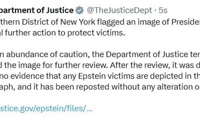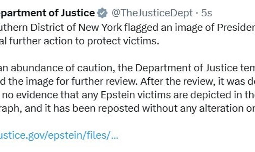 ABD Adalet Bakanlığı tarafından yapılan açıklamada, Trump’ın görüldüğü görselin inceleme için geçici olarak yayından kaldırıldığı; ancak inceleme sonucunda "fotoğrafta Epstein kurbanlarından herhangi birinin görüldüğüne dair bir kanıt bulunmadığı" tespit edildiği ve fotoğrafın "herhangi bir değişiklik veya sansür yapılmadan yeniden yayınlandığı" belirtildi. Bakanlık ayrıca, ilgili fotoğrafa erişim sağlayan bağlantının paylaşıldığını duyurdu.