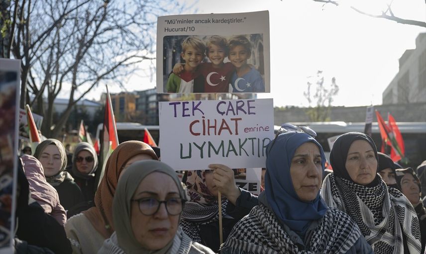 "Kahrolsun İsrail", "İşte burası katillerin yuvası", "Hamas'a, Gazze'ye, direnişe bin selam" ve "Terörist İsrail, terörist Amerika" sloganları atan vatandaşlar, sık sık tekbir getirerek Filistin halkı için dua etti.