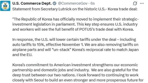 ABD, Güney Kore ile anlaşma kapsamında 1 Kasım’dan itibaren otomobil gümrük vergisini %25’ten %15’e indirecek; uçak parça vergileri kaldırılacak.
