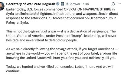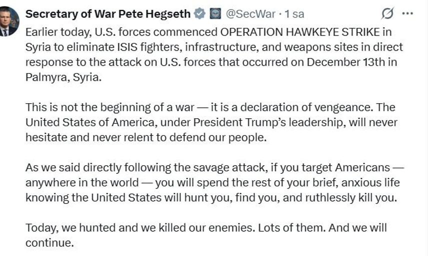ABD Savunma Bakanı Pete Hegseth, sosyal medya platformu X üzerinden ülkenin erken saatlerde Suriye'de "Hawkeye Strike Operasyonu"nu başlattığını duyurdu. Hegseth'e göre operasyon, 13 Aralık'taki saldırıya doğrudan yanıt niteliğinde olup "Operasyon, DEAŞ savaşçılarını, altyapısını ve silah mevzilerini ortadan kaldırmayı amaçlamaktadır" şeklinde tanımlandı. Hegseth, operasyonun bir savaş ilanı değil, misilleme amacı taşıdığını vurguladı ve ABD'nin halkını savunma kararlılığını öne çıkardı.
