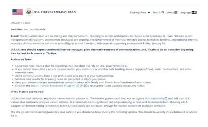 ABD Dışişleri Bakanlığı ve ABD’nin Tahran Sanal Büyükelçiliği, İran’daki şiddet olaylarının devam etmesi nedeniyle ABD vatandaşlarına uyarıda bulundu. Açıklamada, "Artırılmış güvenlik önlemleri, yol kapatmaları, toplu taşımada aksamalar ve internet engellemeleri devam ediyor." ifadeleri yer aldı.