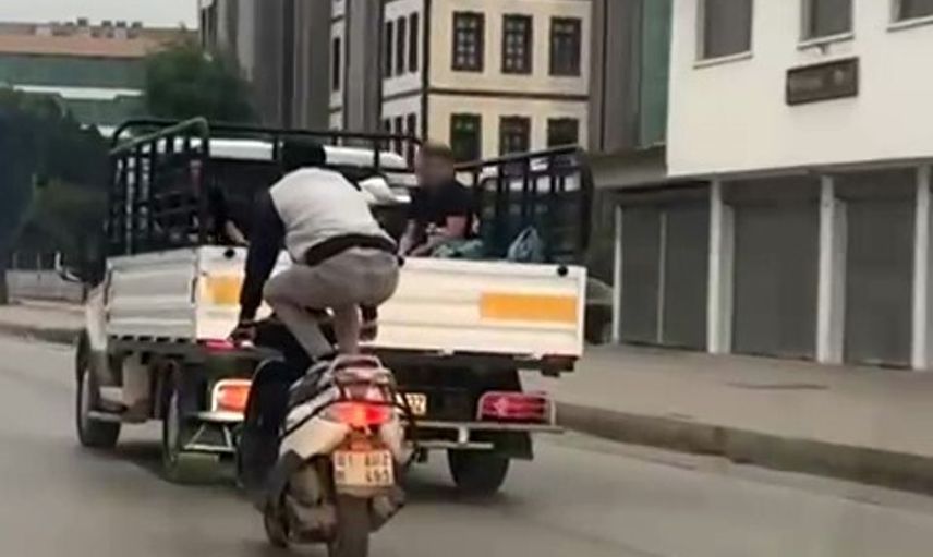 Adana'nın en işlek yollarından biri olan D-400 Karayolu'nda bir motosiklet sürücüsünün sıra dışı sürüşü, yoldaki diğer sürücülerin dikkatini çekti.