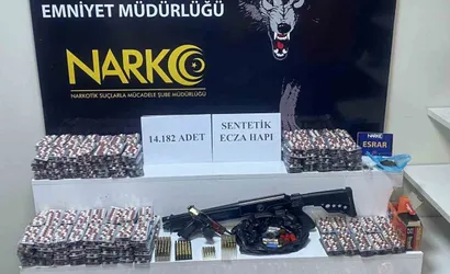 Yapılan aramalarda 14 bin 182 adet sentetik ecza, 10 gram esrar ile ruhsatsız tabanca ve tüfek ele geçirildi.