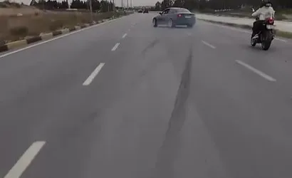 İddialara göre 35 YM 145 plakalı BMW marka araç, yolda drift atarak ilerledi. Bu sırada arkadan gelen bir motosikletli, otomobilin drift hareketleri nedeniyle çarpışmaktan son anda kurtuldu. O anlar, başka bir motosikletlinin kask kamerasına saniye saniye yansıdı.