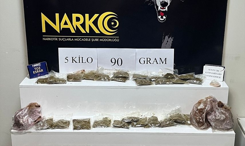 Narkotik dedektör köpeğiyle yapılan aramada, koltuğun altına gizlenmiş poşette 5 kilo 90 gram toz esrar bulundu.
