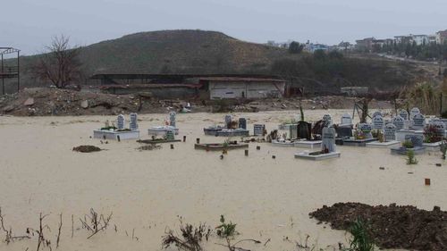 Adana’da sağanak yağış nedeniyle Sarıçam’daki Buruk Cumhuriyet Mahallesi kanalının taşması sonucu Buruk Mezarlığı’ndaki onlarca mezar su altında kaldı.