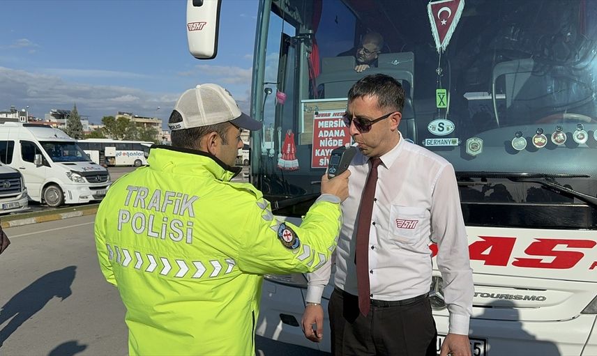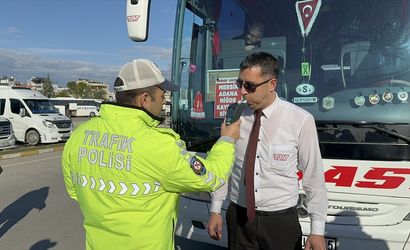 Adana'da, trafik polisleri yılbaşı tedbirleri kapsamında şehirler arası yolcu otobüslerinde denetim gerçekleştirdi.