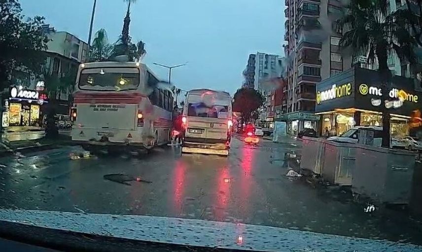 ADANA'DA OTOBÜS SÜRÜCÜSÜNÜN DİĞER MİNİBÜS SÜRÜCÜSÜNÜ SIKIŞTIRARAK KAZAYA SEBEBİYET VERDİĞİ GÖRÜNTÜLER ORTAYA ÇIKTI