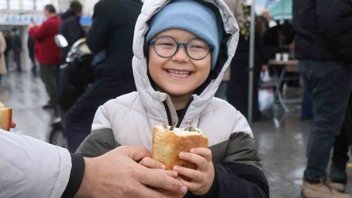 Adapazarı'nda düzenlenen hamsi festivalinde dolu yağışına rağmen vatandaşlar horon oynadı; yaklaşık 2 ton hamsi Gar Meydanı'nda ikram edildi.