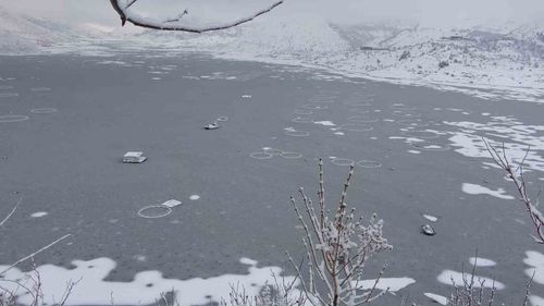 Adıyaman Çelikhan'daki Çat Barajı, kar ve soğuk nedeniyle yaklaşık 15 hektarlık alanda yüzeyi tamamen dondu; balıkçı tekneleri gölette kaldı.