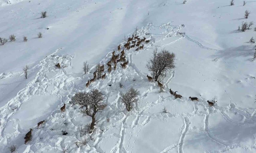 Drone ile havadan görüntülenen sürüler, kar üzerinde ilerleyerek yiyecek aradı. Görüntülerde onlarca yaban keçisinin, bazı yerlerde 1 metreyi geçen kar kalınlığının olduğu alanlardan kayalık bölgelere giderek yiyecek aradığı görüldü.