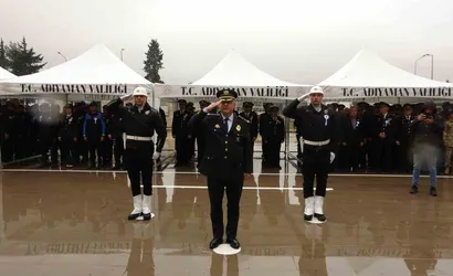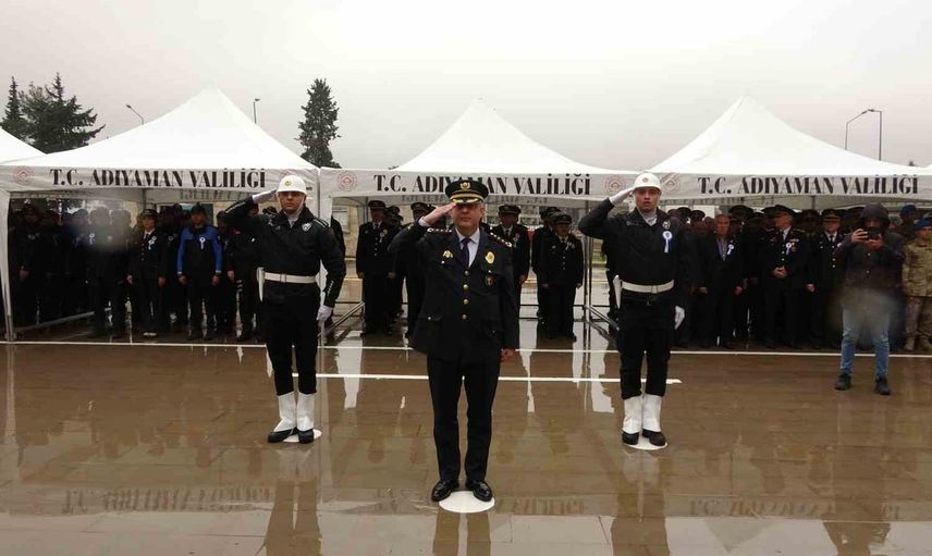 Tören, Adıyaman Valiliği bahçesinde yapıldı. Programa Jandarma Kıdemli Albay Fahri Semiz, İl Emniyet Müdürü Arzum Nazman ve emniyet personelleri katıldı. Tören, Atatürk Anıtı’na çelenk sunulmasıyla başladı; saygı duruşu ve İstiklal Marşının okunmasıyla sona erdi.
