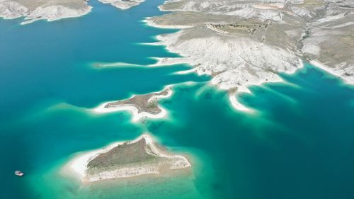 Adıyaman'ın Atatürk Baraj Gölü içinde yer alan yükseltiler ve adacıklar, göz alıcı manzarasıyla Maldivler'i andırıyor. Özellikle yaz aylarının gelmesiyle birlikte su seviyesinin azalması, bu alanların adacıklara dönüşmesine neden oluyor. Havadan çekilen görüntüler, beyaz topraklarla turkuaz suların birleştiği bir doğa harikası…