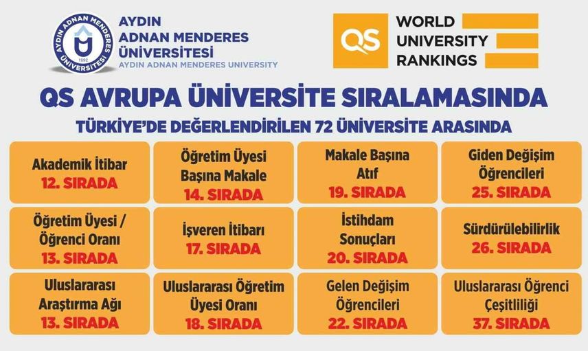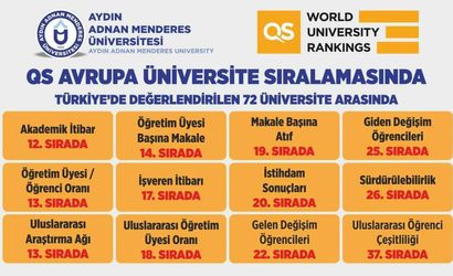 Aydın Adnan Menderes Üniversitesi (ADÜ), uluslararası yükseköğretim derecelendirme kuruluşu QS (Quacquarelli Symonds) tarafından açıklanan 2026 QS Avrupa Üniversite Sıralamasında, Avrupa’daki üniversiteler arasında 701-900 bandında yer aldı ve Avrupa Batı Asya bölgesinde 79. sırada konumlandı.