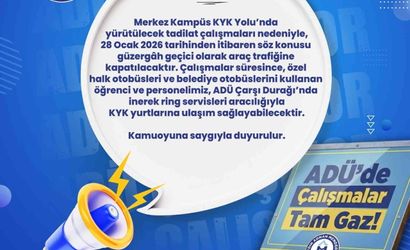 Çalışmalar süresince, özel halk otobüsleri ve belediye otobüslerini kullanan öğrenci ve personel, ADÜ Çarşı Durağı'nda inerek ring servisleri aracılığıyla KYK yurtlarına ulaşım sağlayabilecek. Üniversite duyurusunda alternatif güzergah ve servis kullanımına ilişkin yönlendirmelerin takip edilmesi istendi.