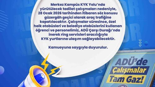 ADÜ, tadilat çalışmaları nedeniyle 28 Ocak 2026'den itibaren Merkez Kampüs KYK Yolu'nu geçici olarak araç trafiğine kapatacağını ve ulaşımın ringlerle sağlanacağını duyurdu.