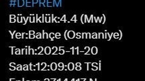 AFAD, Osmaniye'nin Bahçe ilçesinde saat 12.09'da 4.4 büyüklüğünde ve 8.8 kilometre derinlikte deprem meydana geldiğini açıkladı.