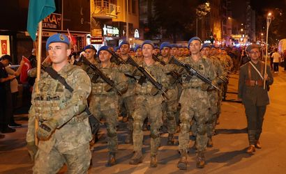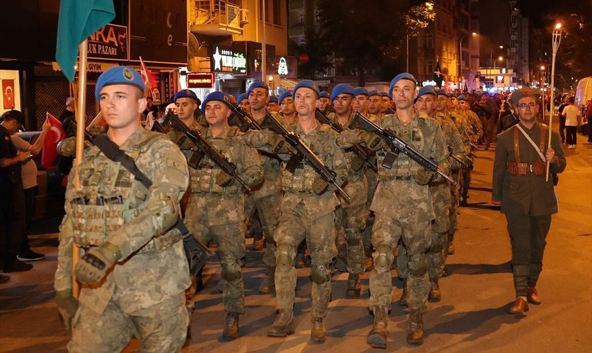 Kurtuluş Caddesi'nden 41'inci Komando Tugay Komutanlığı Birlikleri ve Deniz Kuvvetleri Komutanlığı Bandosu eşliğinde başlayan fener alayında vatandaşlar, ellerinde Türk bayrakları ve meşalelerle Anıtpark'a kadar yürüdü.