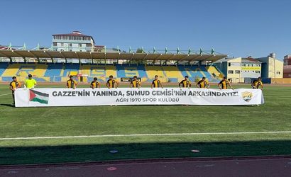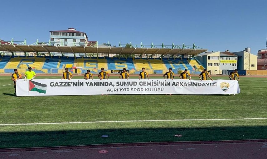 Nesine 3. Lig'de mücadele eden Ağrı 1970 Spor Kulübü futbolcuları, Eti Gübre Mazıdağı Fosfatspor maçına "Gazze'nin Yanında Sumud Gemisi'nin Arkasındayız" pankartıyla çıktı.