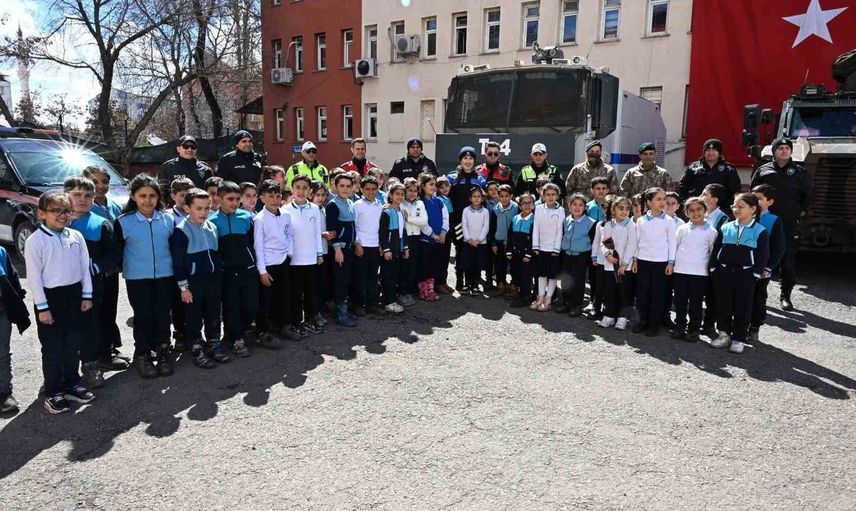 Öğrenciler, Polis Haftası için hazırladıkları resimleri emniyet personeline hediye etti ve polis araçlarını yakından inceleme fırsatı buldu. Araçlara binen öğrencilere ekipler, araçların kullanım amaçları hakkında bilgi verdi.