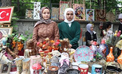 Ağrı'da Halk Eğitim Merkezi bünyesinde kursiyer kadınlarca atık malzemeler kullanılarak hazırlanan resim tabloları, çanta gibi çok sayıda el emeği ürün stantlarda sergilendi. Vali Mustafa Koç (sol 2), Hayat Boyu Öğrenme Şenliği kapsamında müdürlüğün bahçesinde kursiyerlerin ürettikleri ürünlerin stantlarda sergilenmesine ilişkin düzenlenen programda çocuklarla halay çekti.