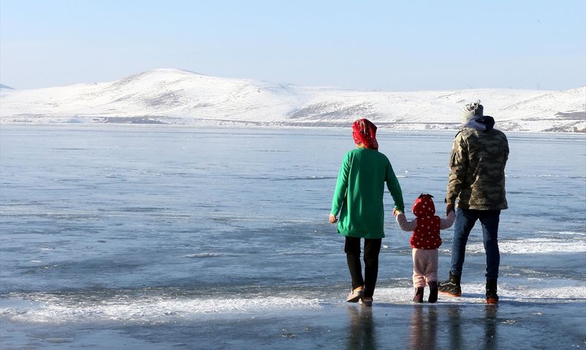Yüzeyinin büyük bölümü buzla kaplanan Çıldır Gölü'nün Ardahan tarafındaki Akçakale bölgesine gelenler, buz tabakası üzerinde gezinti yaptı.