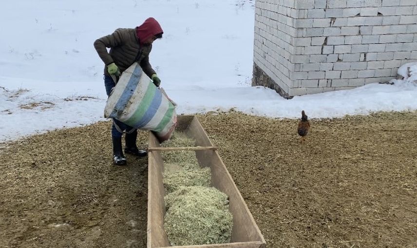İlçe kırsalında gözlemlenen uygulamada, hayvanlara gün içinde verilecek yemler sabahın erken saatlerinde hazırlanıyor. İlçeye 15 kilometre uzaklıktaki Aşağı Göçmez köyünde sabahın ilk ışıklarıyla işe koyulan besiciler, sırtlarında ve kızakla taşıdıkları otları karın üzerine sererek hayvanları gün boyunca besliyor.