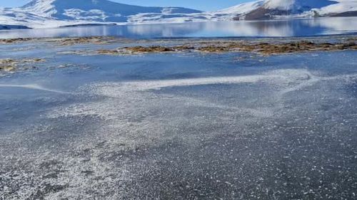 Ağrı Taşlıçay'daki Balık Gölü, mevsim normallerinin altındaki hava nedeniyle kıyı ve sığ alanlarda kısmen buz tuttu; bazı bölümler ise açık su olarak kaldı.