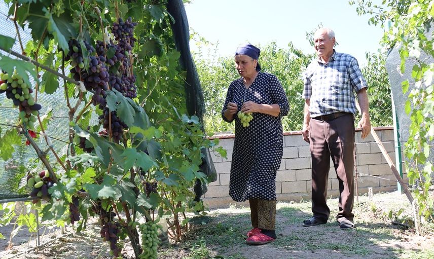 Erzincan'ın Üzümlü ilçesinde yaşayan Ahıska Türkü Faik ile Gülşen Binali çifti, döşek arasında Ukrayna'dan getirdikleri fidanlarla bahçelerinde 300 metrekarelik alanda yetiştirdikleri 70 farklı üzüm çeşidiyle geçimlerini sağlıyor.