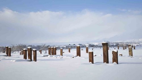 Bitlis'in Ahlat ilçesinde kar yağışı sonrası Selçuklu Meydan Mezarlığı ve diğer tarihi mekanlar beyaza bürünerek etkileyici kış manzaraları oluşturdu.
