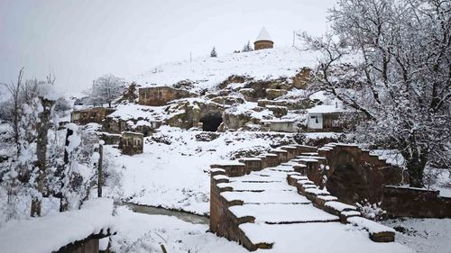 Bitlis'in Ahlat ilçesini 13 Nisan 2026'de etkileyen nisan karı, Selçuklu Meydan Mezarlığı, kümbetler, Bayındır Köprüsü ve mağara evlerinde etkileyici görüntüler oluşturdu.