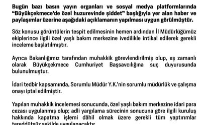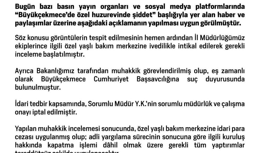 Aile ve Sosyal Hizmetler Bakanlığı, bazı basın yayın organları ile sosyal medya platformlarında yer alan “Büyükçekmece’de özel huzurevinde şiddet” iddialarına ilişkin yazılı açıklama yayımladı. Bakanlık, il müdürlüğü ekiplerinin konuya ilişkin gerekli incelemeyi başlattığını bildirdi.