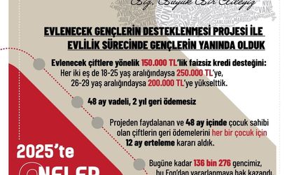 Açıklamada, evlenecek çiftlere yönelik verilen faizsiz kredi desteğinin temel tutarının 150 bin lira olduğu, her iki eşin de 18-25 yaş aralığında olması hâlinde desteğin 250 bin liraya, 26-29 yaş aralığındaysa 200 bin liraya yükseltildiği ifade edildi.