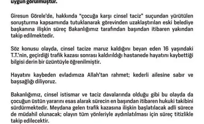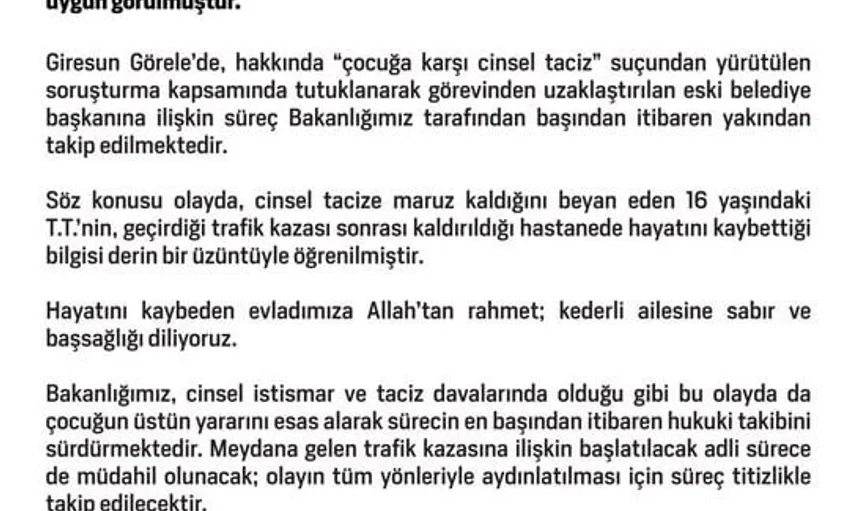 Bakanlık açıklamasında, cinsel tacize maruz kaldığını beyan eden 16 yaşındaki T.T.'nin geçirdiği trafik kazası sonrası kaldırıldığı hastanede hayatını kaybettiği bilgisinin derin bir üzüntüyle öğrenildiği belirtildi. Açıklamada, "Hayatını kaybeden evladımıza Allah’tan rahmet; kederli ailesine sabır ve başsağlığı diliyoruz" ifadesine yer verildi.