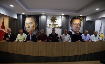 AK Parti Aydın İl Başkanı Mehmet Erdem, ertelenen Büyükşehir Meclis toplantısına ilişkin, "CHP grubu Aydın'ın geleceğini şekillendirecek ve vatandaşlarımızın yaşam kalitesini doğrudan yükseltecek hayati yatırımlara ret oyu kullanmıştır." dedi. Toplantıya AK Parti Milletvekili Ömer Özmen (sol 4) ve ilçe belediye başkanları katıldı.