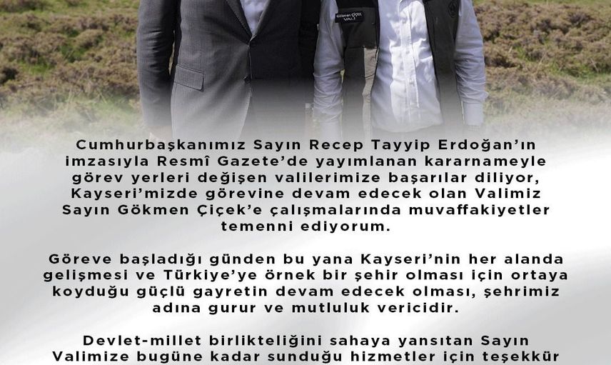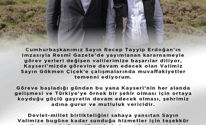 AK PARTİ KAYSERİ İL BAŞKANI HÜSEYİN OKANDAN, VALİ GÖKMEN ÇİÇEK'İN KAYSERİ'DEKİ GÖREVİNE DEVAM EDECEK OLMASININ ARDINDAN YAPTIĞI AÇIKLAMADA; "GÖREVE BAŞLADIĞI GÜNDEN BU YANA KAYSERİ’NİN HER ALANDA GELİŞMESİ VE TÜRKİYE’YE ÖRNEK BİR ŞEHİR OLMASI İÇİN ORTAYA KOYDUĞU GÜÇLÜ GAYRETİN DEVAM EDECEK OLMASI, ŞEHRİMİZ ADINA GURUR VE MUTLULUK VERİCİDİR" DEDİ.