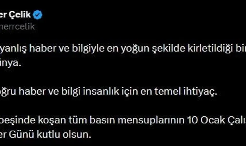 AK Parti Sözcüsü Ömer Çelik, 10 Ocak Çalışan Gazeteciler Günü'nü sosyal medya hesabından kutladı. Paylaşımında gerçeğin peşinde koşan tüm basın mensuplarına yönelik takdirini ifade etti.