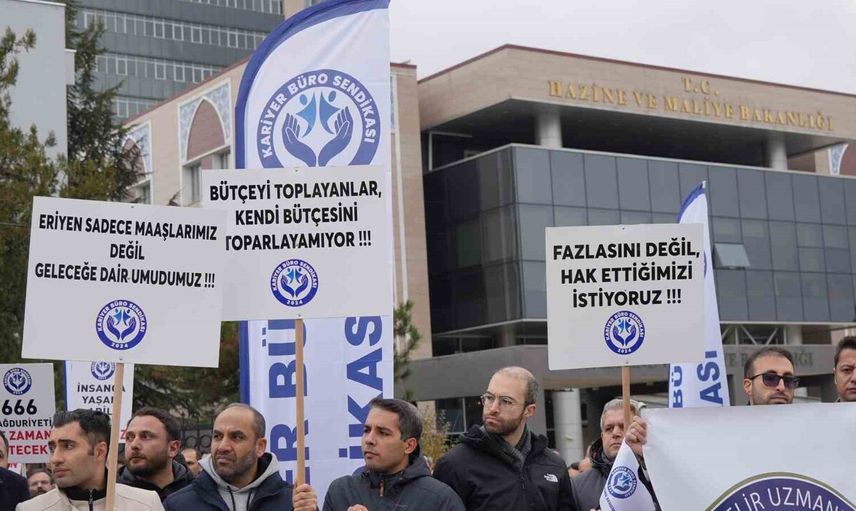Kariyer Büro Sendikası Genel Başkanı Tolga Akgül, Ankara'da Hazine ve Maliye Bakanlığı önünde gerçekleştirilen eylemde, 2011'de çıkarılan 666 sayılı KHK'nın kariyer meslekler arasında merkezi ve taşra ayrımı oluşturarak uzun soluklu bir mağduriyete yol açtığını söyledi.