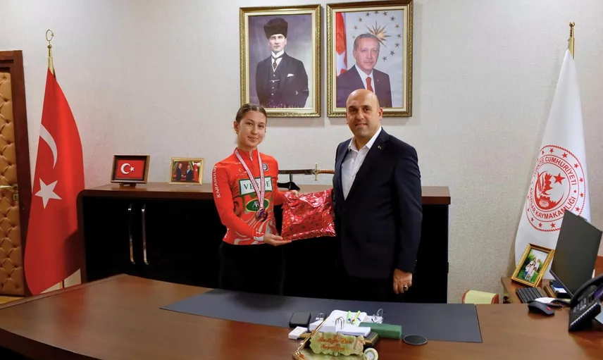 MİLLİ TAKIMA SEÇİLEREK DÜNYA ŞAMPİYONASI BİLETİ ALAN BİSİKLETÇİ NAZİFE TUNÇEL, KAYMAKAM MUSTAFA CAN’I ZİYARET EDEREK SÜREÇ HAKKINDA BİLGİ VERDİ.